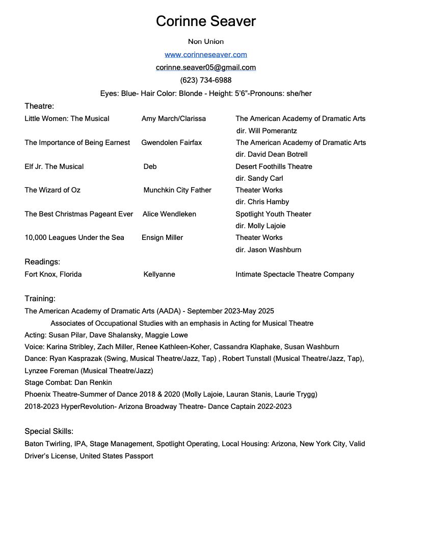 Corinne is a New York City based Actor. She graduated in May of 2025 from the American Academy of Dramatic Arts in their inaugural Acting for Musical Theatre Program.